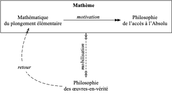 D’où son mobile proprement philosophique : démontrer philosophiquement que le conditionnement de la philosophie par des œuvres-en-vérité (qui ne lui sont pas immanentes) autorise cependant de penser philosophiquement l’inventivité conditionnante de ces mêmes œuvres-en-vérité, et par là démontrer que la philosophie peut réfléchir son conditionnement en l’endogénéisant : l’endogène philosophique vient ici se substituer à une impossible immanence philosophique aux vérités.