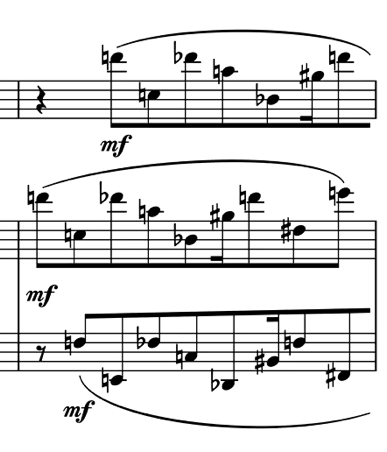 Prenons pour cela l’exemple musical du Merle noir de Messiaen [45] : c’est une chose de dégager la capacité d’Olivier Messiaen d’imiter musicalement le merle quand le merle, lui, ne sait que chanter comme un merle ; sauf que cette capacité est celle du musicien plutôt que de la musique proprement dite s’il est vrai, qu’en un sens, la musique ne sait rien de l’existence ni d’un oiseau ni du titre qu’un musicien vient lui donner en extériorité langagière complète si bien que, musicalement pensée, en intériorité donc à ce qu’est la musique, l’imitation (dont il est en effet question ici à l’initiative du musicien) ne deviendra réellement musicale que lorsqu’elle sera convertie en catégorie proprement musicale, c’est-à-dire en capacité de la musique à s’imiter (et non plus en la capacité du musicien à imiter le merle). Une telle imitation musicalement concrète a un nom musical bien connu : c’est le canon. Et en effet un tel canon se trouve bien à l’œuvre en cours de développement musical dans la pièce de Messiaen et ce sera en effet ce moment qui donnera la clef d’une écoute musicale à l’œuvre [46].