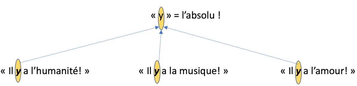Cette idée neuve – grandiose en effet - résonne tout particulièrement bien dans la langue française puisque l’absolu devient le nom du lieu auquel renvoie le pronom adverbial « y » dans l’expression « il y a ». En effet, quand on dit par exemple : « il y a l’humanité », ou « il y a la musique », ou « il y a l’amour », etc. [49], quel est cet endroit où reposent ces idées d’humanité, de musique, d’amour, etc., quel est le « y » du « il y a » si ce n’est cet absolu ? C’est bien dans l’absolu qu’on peut penser qu’il y a le collectif - voire le groupe - infini des êtres humains, vivants, morts et à venir [50].