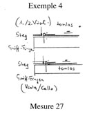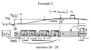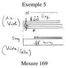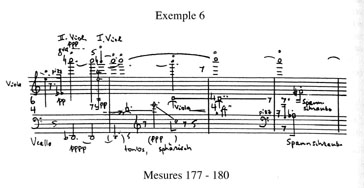 Dans d'autres oeuvres, en dehors d'une signification marginale, si le mode de jeu "flautato" se présentait comme l'étouffement mat du son, il réalise ici ce que je décrivais dans mon premier texte d'introduction sous le terme de "l'air joué à partir des notes". Ce mode de jeu devient alors une plaque tournante autour de laquelle s'établit un univers de bruits et de sons variés qui va de la disparition complète du son jusqu'à la consonance saturée d'un accord de Do bémol majeur.