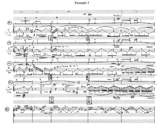 Dans Gran Torso, il fallait que la pratique musicale elle-même soit élargie, voire dépaysée, sans "sortie dérobée" possible. Ma poétique, ou plus concrètement la présentation du résultat de ma syntaxe sonore, devait être "la" contradiction apportée à une habitude sonore et musicale propre à l'ensemble instrumental choisi. Ce processus s'est révélé fécond car, mon idée (ma vision) ainsi que ma technique compositionnelle s'aiguisaient, se précisaient et se développaient à travers lui. La note et le bruit n'étaient plus en opposition, mais devenaient, sous des formes toujours changeantes, des variantes d'une catégorie sonore supérieure. (Ainsi en est-il du bruit de frottement de l'archet comme le produit évident de la transformation d'un mouvement de trémolo d'archet, ralenti et déformé, que l'instrumentiste glisse sur la corde jusqu'au chevalet. De même, le jeu "legno battuto" sur des cordes étouffées peut être considéré, ici, comme une articulation ppp du silence, ou comme une variante d'impulsion là, au même titre que les pizzicatto ou d'autres interventions très courtes. Mais comme produit de l'impulsion verticale de l'archet sur la corde, il est alors possible de le mélanger avec d'autres gestes de l'archet, que ce soit en sautant, en glissant, en tirant ou en jetant celui-ci. Chacune de ces actions produit un bruit caractéristique, mais elle produit aussi une hauteur précise que l'on peut utiliser dans un autre contexte.) Dans Pression, mon étude pour violoncelle que j'ai écrite précédemment, l'aspect énergétique polyvalent propre à l'oeuvre s'y thématisait lui-même et c'est son "développement" qui embrasait l'oeuvre entière.