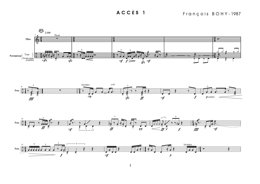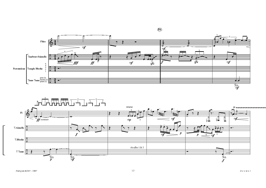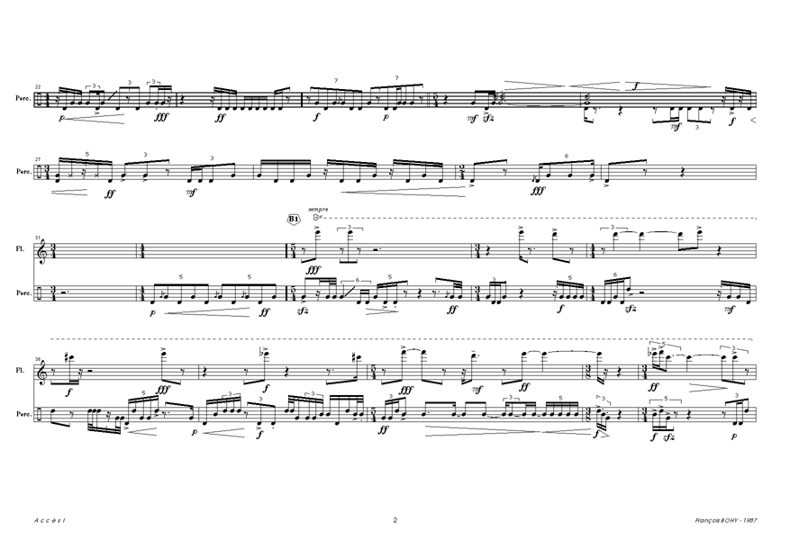 Pour Grande Flûte et Flûte Alto, Percussions a peau (batterie, puis tambour d'aisselle) augmentée de wood-blocks et Tams-Tams à la fin.