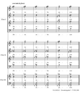 Cette impuissance de la musique, dans le Requiem, à se tenir à hauteur des voix du Monde, à dialoguer à armes égales avec elles, à les intégrer dans son propre monde en leur donnant droit d’existence autonome tout en les modelant (rythmiquement et harmoniquement) selon ses lois musicales propres, cette impuissance culmine en cette fin du Requiem en un long silence musical qui ne peut plus être conclus que par un cri d’appel au Grand Autre ; mais cette impuissance est à mon sens à l’œuvre tout au long des quatre parties, et un symptôme frappant en réside dans la maigreur du matériau musical mobilisé par des effectifs pourtant plantureux.