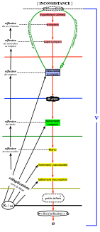 Ici un point délicat : dans la partie ascendante du processus, selon l’échelle de Jacob, l’absolu est vu comme sommet inatteignable, comme au-delà d’inconsistance situé à l’extrémité supérieure du schéma ; mais une fois la charnière établie (en frôlant la borne supérieure dite de Kunen), l’absolu s’avère plutôt le lieu récapitulant [d] l’ensemble des formes possibles de l’être, autant dire le lieu même de déploiement intégral de notre double échelle.