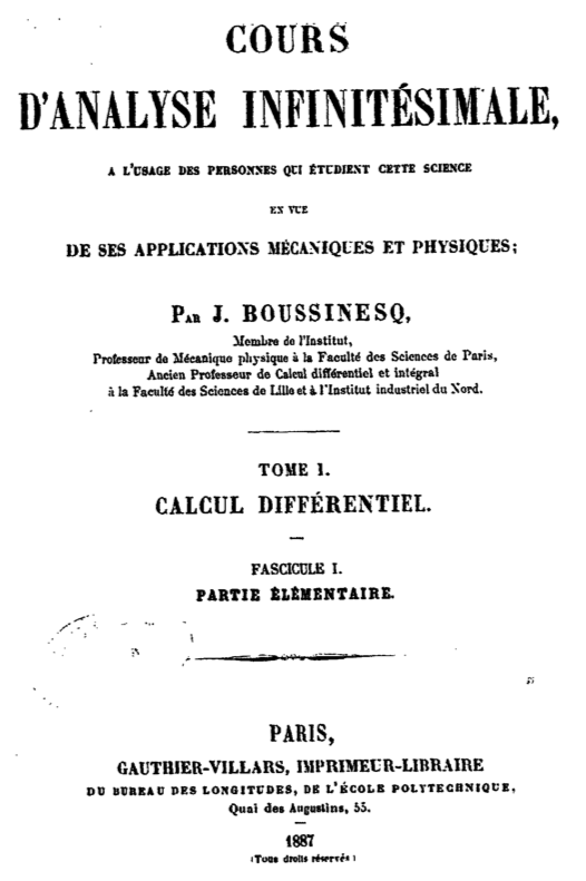 Comme le dit excellemment Joseph Boussinesq dans son Cours d’analyse infinitésimale de 1887 :