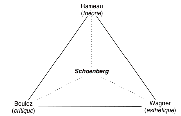 Le centre de gravité de l’intellectualité musicale boulézienne n’est pas, comme chez Schoenberg, au centre du triangle critique-théorique-esthétique mais nettement déporté vers son pôle critique : c’est chez Boulez la dimension critique (bien plus que les dimensions théorique ou esthétique) qui donne le ton.