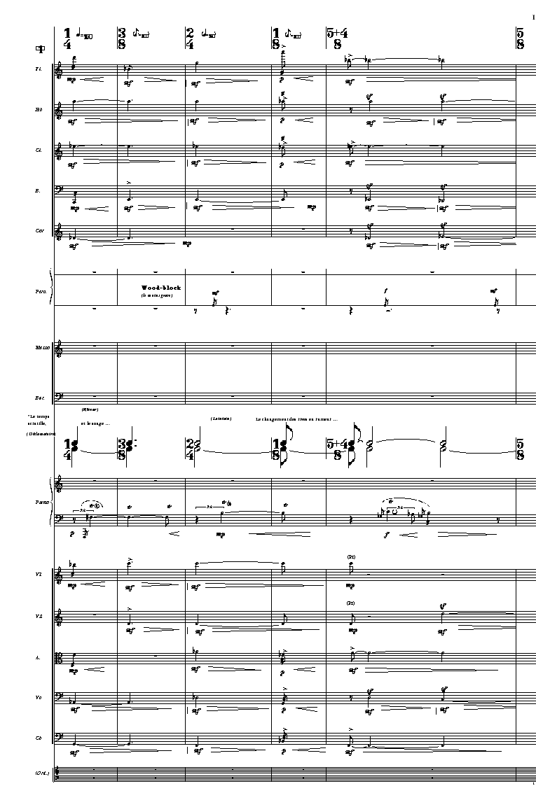 * Le texte utilisé, faisant bilan de la politique d'émancipation en ce siècle, apporte sa dynamique propre - vaste flot rythmé - qu'on s'est efforcée de préserver et de restituer localement. Une voix préenregistrée (celle d'un ami, Alain Badiou, auteur du poème) en prononce des fragments significatifs qui ont été retravaillés pour les accorder au tempo instrumental et les profiler en une sorte d'étrave parcourant le flot instrumental et déposant derrière elle le sillage bruissant de quelques mots. J'ajoute que ce texte me procure le plaisir de pouvoir aujourd'hui faire chanter ces mots précieux ouvrière, usine que notre temps voudrait oublier