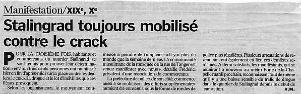 POUR LA TROISIÈME FOIS, habitants et commerçants du quartier Stalingrad se sont réunis pour prouver leur détermination : environ trois cents personnes ont manifesté hier en fin d'après-midi sur la place contre les dealers, le crack, la drogue et le lot d'incivilités que ces fléaux provoquent. Selon les organisateurs, le mouvement commence à prendre de l'ampleur : « Il y a plus de monde que la semaine dernière. La communauté musulmane de la mosquée de la rue de Tanger est venue manifester avec nous », détaille Frédéric, président d'une association de commerçants. La préfecture de police, de son côté, commence aussi à se mobiliser : des efforts supplémentaires auraient été consentis, sous la forme de rondes de police plus régulières. Plusieurs arrestations de revendeurs ont également eu lieu ces dernières semaines. A demi-satisfaits, les manifestants, qui se réuniront à nouveau au métro Porte-de-la-Chapelle mardi prochain, reconnaissent tout de même qu'il y a une baisse sensible du trafic de drogue dans le quartier de Stalingrad depuis le début de leur action.