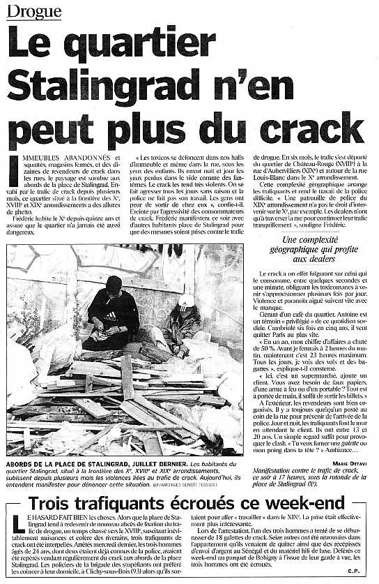 IMMEUBLES ABANDONNÉS et squattés, magasins fermés, et des dizaines de revendeurs de crack dans les rues, le paysage est sombre aux abords de la place de Stalingrad. Envahi par le trafic de crack depuis plusieurs mois, ce quartier situé à la frontière des X e , XVIII eet XIX e arrondissements a des allures de ghetto. Frédéric habite le X e depuis quinze ans et assure que le quartier n'a jamais été aussi dangereux. « Les toxicos se défoncent dans nos halls d'immeuble et même dans la rue, sous les yeux des enfants. Ils errent nuit et jour les yeux perdus dans le vide comme des fantômes. Le crack les rend très violents. On se fait agresser tous les jours sans raison et la police ne fait pas son travail. Les gens ont peur de sortir de chez eux », confie-t-il. Ereinté par l'agressivité des consommateurs de crack, Frédéric manifestera ce soir avec d'autres habitants place de Stalingrad pour que des mesures soient prises contre le trafic de drogue. En six mois, le trafic s'est déporté du quartier de Château-Rouge (XVIII e ) à la rue d'Aubervilliers (XIX e ) et autour de la rue Louis-Blanc dans le X e arrondissement. Cette complexité géographique arrange les trafiquants et rend le travail de la police difficile. « Une patrouille de police du XIX e arrondissement n'a pas le droit d'intervenir sur le X e , par exemple. Les dealers n'ont qu'à traverser la rue pour continuer leur trafic tranquillement », souligne Frédéric.