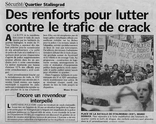 A LA SUITE de la manifestation contre le trafic de crack menée par les habitants du quartier Stalingrad, le maire du X e , Tony Dreyfus, a annoncé des renforts policiers pour le commissariat de son arrondissement. « Le préfet de police de Paris m'a confirmé il y a quelques jours qu'une cinquantaine d'agents de police supplémentaires seraient affectés dans les six prochains mois à notre commissariat. Ce renfort représente une hausse d'environ 15 % des effectifs pour notre arrondissement », a-t-il souligné. Autre arrondissement touché par la recrudescence du trafic, le XIX e tente de répondre aux attentes des riverains. Lundi dernier, une équipe municipale a supprimé les palissades qui entouraient les terrains vagues proches de la rue d'Aubervilliers. Elles ont été remplacées par de larges grilles métalliques offrant une meilleure visibilité sur les friches pour la police. Ces terrains, laissés à l'abandon, servent quotidiennement de lieux de deal aux toxicomanes. D'autre part, des travaux d'urbanisme devraient débuter dès le mois de janvier prochain autour du boulevard de la Villette et du passage Goix. Au programme : construction de logements sociaux, aménagements de voirie et réalisation d'équipements publics (halte-garderie, école maternelle et jardin public) seront lancés pour réhabiliter le quartier. Dans l'urgence, habitants et commerçants des X e et XIX e arrondissements maintiennent leur action. Ils se réuniront chaque mardi aux abords du lieu du trafic jusqu'à sa disparition.