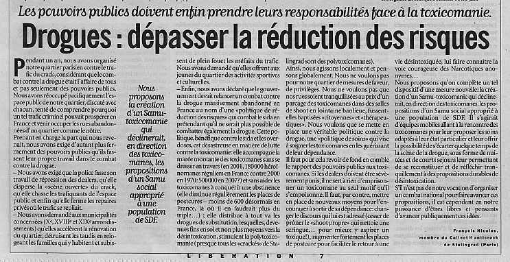 - Enfin, nous avons déclaré que le gouvernement devait relancer un combat contre la drogue massivement abandonné en France au nom d'une «politique de réduction des risques» qui combat le sida en prétendant qu'il ne serait plus possible de combattre également la drogue. Cette politique, bénéfique contre le sida et les overdoses, est désastreuse en matière de lutte contre la toxicomanie : elle accompagne la marée montante des toxicomanes sans se dresser en travers (en 2001, 180 000 héroïnomanes réguliers en France contre 2 000 en 1970 : 500 000 en 2007 ?) et sans aider les toxicomanes à conquérir une abstinence (elle diminue régulièrement les places de postcures - moins de 600 désormais en France, là où il en faudrait plus du triple...) ; elle distribue à tout va les drogues de substitution, lesquelles, devenues fins en soi et non plus moyens vers la désintoxication, stimulent la polytoxicomanie (presque tous les «crackés» de Stalingrad sont des polytoxicomanes).