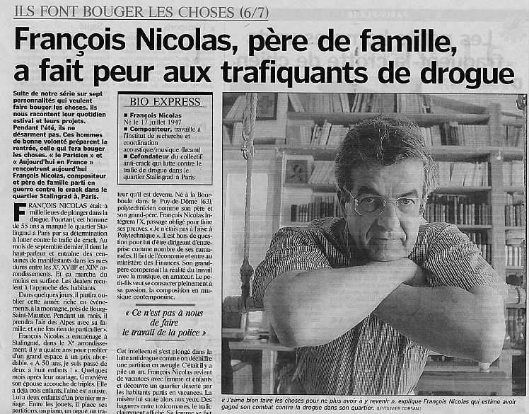 Cet intellectuel s'est plongé dans la lutte antidrogue comme on déchiffre une partition en aveugle. C'était il y a pile un an. François Nicolas revient de vacances avec femme et enfants et découvre un quartier déserté par les habitants partis en vacances. La misère lui saute alors aux yeux. Des bagarres entre toxicomanes, le trafic clairement affiché. Sa femme se fait agresser, « pour 100 F avec un cutter ». Lui, qui ne connaît pas ce quartier et aime à rester solitaire pour composer dans son bureau, est touché dans son intimité. « J'ai eu l'impression de ne pas avoir le choix devant la gravité de la situation. » Il décide d'agir et s'organise avec les commerçants autour du collectif anticrack. Leur idée est simple, manifester chaque semaine jusque sur les lieux mêmes du trafic pour appeler à plus de présence policière. Déjà il y a dix ans, les riverains s'étaient rassemblés pour dire stop. Mais le trafic, parti un temps à Château-Rouge (XVIII e ), était revenu. Les premiers tracts cherchent à heurter les esprits. « Les femmes se font agresser dans la rue (...) les enfants ne peuvent plus circuler sans rencontrer des gens défoncés et dangereux. » Un phrasé paniquant, controversé, signe du ras le bol des riverains qui lui vaudra l'inimitié de plusieurs associations d'aide aux toxicomanes. « Ce n'est pas à nous, habitants, de faire le travail de la police à sa place », pouvait-on lire dans le premier tract et pourtant... Fort de l'ampleur gagnée au fil des manifestations, tous souhaitent se réapproprier « leur quartier ». Nicolas et quelques autres comprennent rapidement que si les gens ont moins peur, rien n'est réglé. Le trafic est alors sur la défensive, mais reste latent. Nicolas commence à s'intéresser aux questions de fond, à la politique de réduction des risques. Intransigeant, il critique la politique gouvernementale et prône la méthode dure, l'abstinence en postcure contre la substitution. Les professionnels du secteur lui reprochent sa méconnaissance sur les questions de toxicomanie. « Nous avons toujours voulu travailler à un niveau local uniquement », dit-il. Avec huit autres hommes, ils forment un groupe de pères de famille et décident d'aller à la rencontre des toxicomanes et des habitants lors de tournées de rue nocturnes et non violentes. De mars à mai, les « pères » descendent dans les rues, vont au contact. Nicolas demande souvent aux toxicomanes ce qu'il peut faire pour aider. Mais l'enfer de la drogue ne se joue pas sur une simple question de volonté. Lui qui n'a jamais touché à la drogue ne comprend pas. « Les drogués disent qu'ils tentent d'intensifier leur existence avec la drogue. Moi, je le fais avec la musique, avec l'amour. »