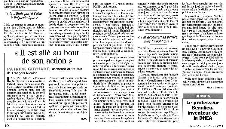 Cet été, les « pères » ont poursuivi leur lutte. Plusieurs rassemblements ont été organisés aux pieds de trois immeubles du quartier, connus pour abriter le trafic de crack et toujours habités par quelques familles. L'un des bâtiments, nommé « crackhouse » a été vidé et fermé, les familles relogées. Certains prétendent que François Nicolas aurait des vues électoralistes. « Complètement faux ! », rétorque-t-il entre cynisme et agacement. Politisé mais pas politique. En 1968, il a 21 ans et devient éducateur de rue bénévole, du côté de la Bastille. Militant catholique, il travaille avec les jeunes désoeuvrés de l'époque. Passe son permis poids lourd pour pouvoir emmener les bandes d'ados à la campagne tout en suivant ses cours à l'X. « J'ai découvert la pensée avec la politique ». Mais l'homme n'a jamais voté. Dans les années 70, il poursuit ses actions dans différents mouvements, pour les foyers Sonacotra, les ouvriers. « Je n'ai jamais joué au prolo. » Il se dit consterné par le déclin des activités politiques en France. Aujourd'hui, François Nicolas pense avoir gagné son combat. Le quartier est rassuré : des habitants, des gens comme les autres ont eu le courage, l'opiniâtreté de dire non. Les « pères » ont proposé dernièrement la création d'un Samu antidrogue inspiré du Samu social. Lui estime qu'il est temps de passer à autre chose. « J'aime bien faire les choses pour ne plus avoir à y revenir. C'est mon côté logique. Les questions de drogue ne m'intéressent pas particulièrement. Nous avons préféré refuser la misère que de passer devant sans oser la regarder. Ici, il y aura toujours du trafic, mais s'il est résiduel, supportable, je peux arrêter. Désormais, j'ai mieux à faire. Une oeuvre musicale, écrire des livres. » Voire une autre croisade : François Nicolas s'intéresse à la question du sida en Afrique.